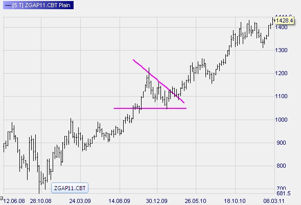 A trend continuation pattern indicated by a “flag”. Gold market.