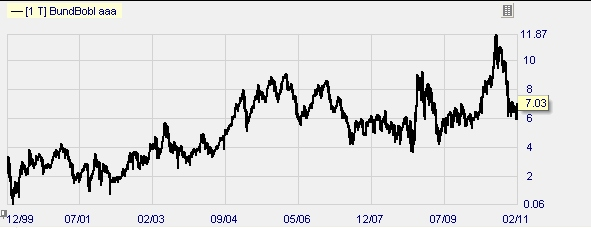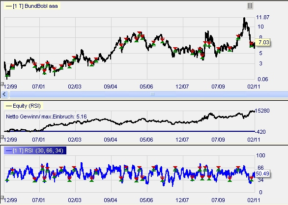 Long term strategy: Trading the BUND-BOBL spread going contrarian by using the simple RSI oscillator, calculated on 30 days. When abonve 66 we go short, below 33 we go long. That would have worked well.