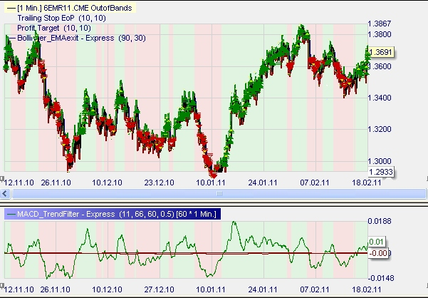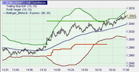 Market (again Euro-USDollar, 1 minute) moves out of lower Bollinger Band and moves bearish until it reaches the 10 point profit target.