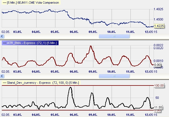 7.1. The volatility of any market (here it is the Euro vs. US-Dollar, 5 minutesw-chart, some days in 2011) can be measured and shown by the indicators “Average Ture Range” (ATR) and/or “Standard Deviation” (StDev)