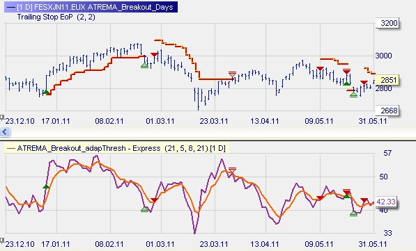 7.4. Combined with a trailing stop with could make a good strategy on a multi-day-trading. The EMA on the ATR presents entry signals long and short equally. This example shows that volatily increases serve as good entry points for trades.
