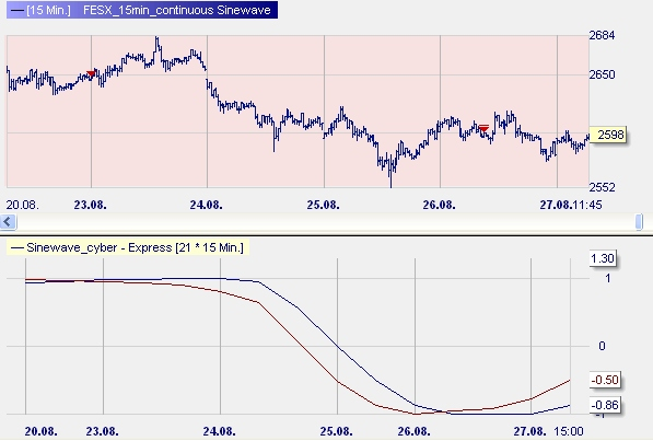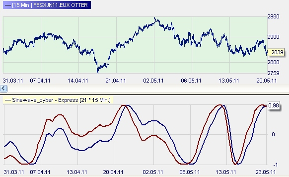 FESX(15 minutes), The Sinewave Indicator from Dr. John Ehlers, a very sophisticatd indicator indicating the cyclical behavior of any market.