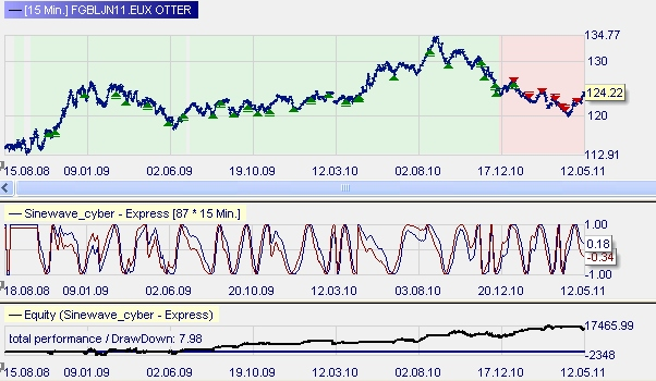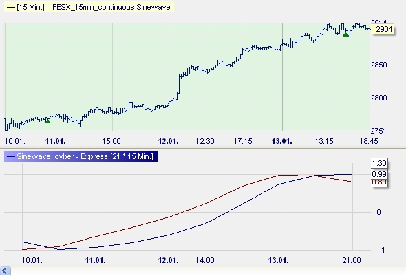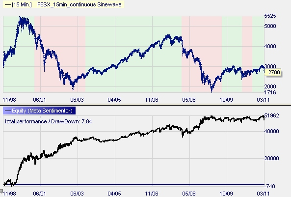 FESX(15 minutes) The Sinewave has hit the trend changes pretty perfect. But those years were years of very strong trends.